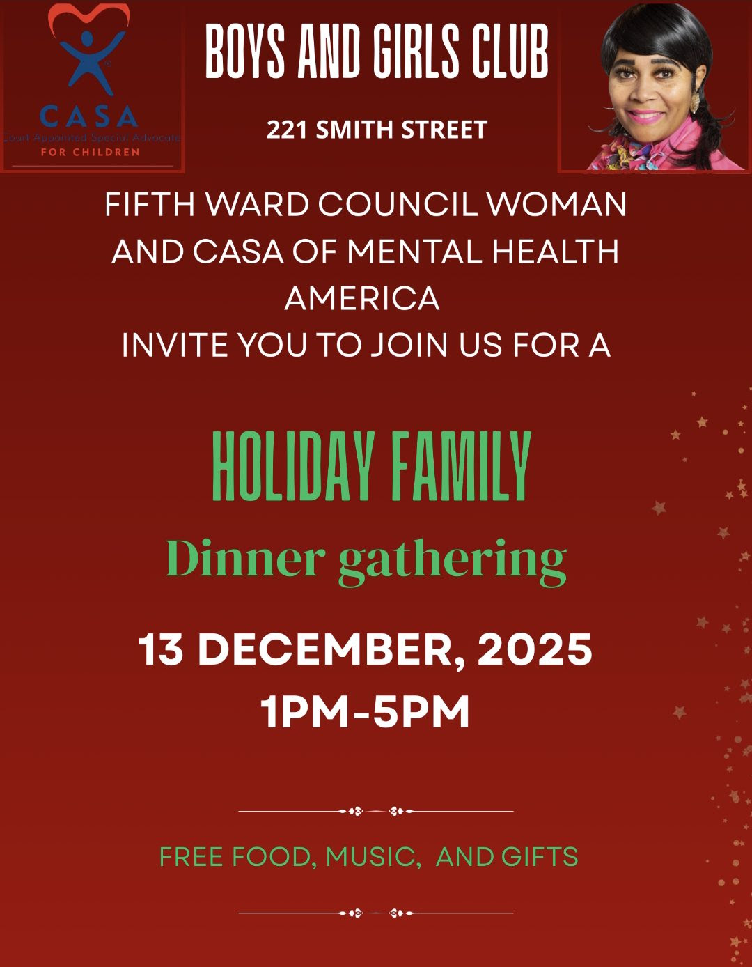 Fifth Ward Council Woman and CASA of Mental Health America invite you to join them for a holiday gathering! There will be free food, music, and gifts.